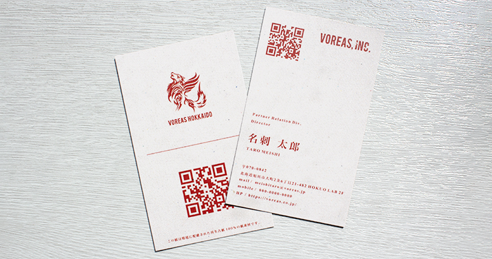 デザイン性を保つための影の立役者となったのが、名刺の中央に配置されたQRコードである。株式会社VOREASはスポーツチームの運営企業だが、環境事業も行っている。監督やコーチ、トレーナーはチームの情報ページやSNSを紹介し、社員は会社ホームページへリンクさせる、といったことも可能だ。名刺ではあえて載せず、シンプルかつデザイン性の高い名刺を作り上げた。