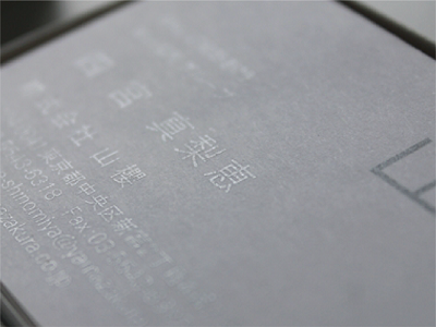 印刷は2色で、いずれもコーポレートカラーとなっている。桜を思わせるピンク色は、ひときわ存在感を感じさせる。 また全体的には、もうひとつのコーポレートカラーであるシルバーを採用。 シンプルな名刺デザインの中に、キラリと光る文字が美しい。