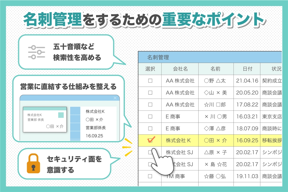 また、名刺交換の日付や状況などをメモしておくことも重要です。 名刺をデジタル管理する際には、営業に直結するような仕組みを整えるのがおすすめです。 名刺管理システムと社内の既存システムを連携させて業務効率を高める例もあります。 営業支援システムや顧客管理システムと連携させられる名刺管理システムを利用すれば、営業活動がしやすくなり部署全体の効率アップが見込めます。 名刺をストックするにあたってはセキュリティ対策も意識しておきましょう。 名刺には個人情報が盛り込まれているため、紛失や流出が起きると大きなダメージにつながります。 特に、デジタルデータの情報漏えいは個人情報保護法違反に該当することもあるので気をつけたいものです。 セキュリティレベルの高いシステムを導入し、さらにアクセス権などの設定も行い、名刺データを確実に管理しましょう。