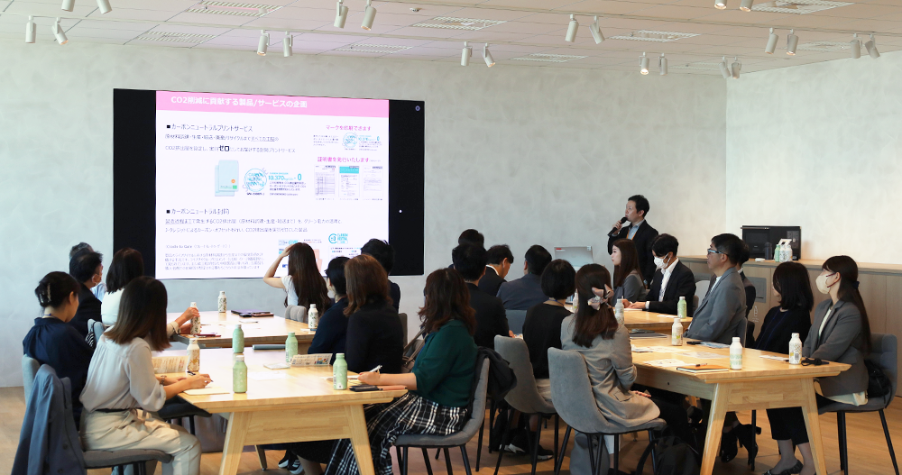 イベントの幕開けを飾ったのは、株式会社山櫻 マーケティング部門 部長 村上氏による講演です。カーボンニュートラルの最新知識を紹介するとともに、山櫻におけるカーボンニュートラルの取り組みや、紙の名刺が環境に与える影響について解説しました。さらに「環境保全と本当の豊かさの共存」をテーマに、持続可能な未来に向けたヒントを参加者へ共有しました。