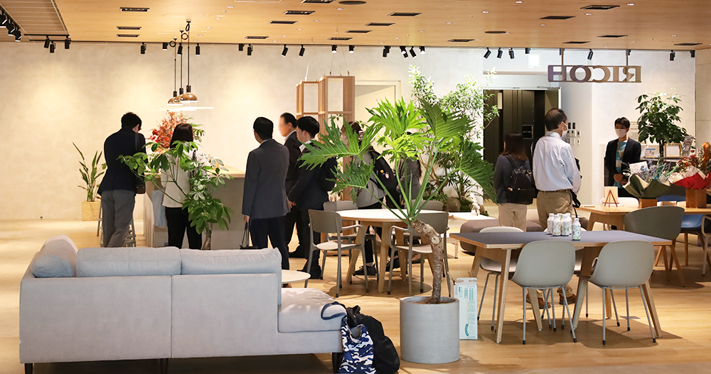 会場は、日本橋の共創型オフィス「ViCreA 東京」。自然光とグリーンの爽やかな雰囲気を感じる空間に、サステナブルなアイテムが並び、入った瞬間からワクワク感が止まりません!受付ではロスフラワーのお祝い花を飾り、細部にまでこだわりを感じられる演出を行いました。